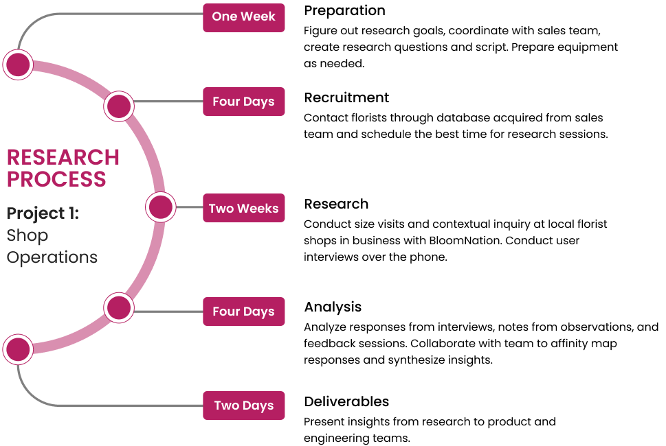 During Fall of 2018, I worked as a UX Research Intern for BloomNation, a B2B platform and an online floral marketplace offering florists a platform for running their business as well as connecting local florists and consumers. With an upcoming redesign and transformation of their Point of Sale system, they needed help figuring out what the needs of florists were as well as gathering feedback to inform their design strategy.