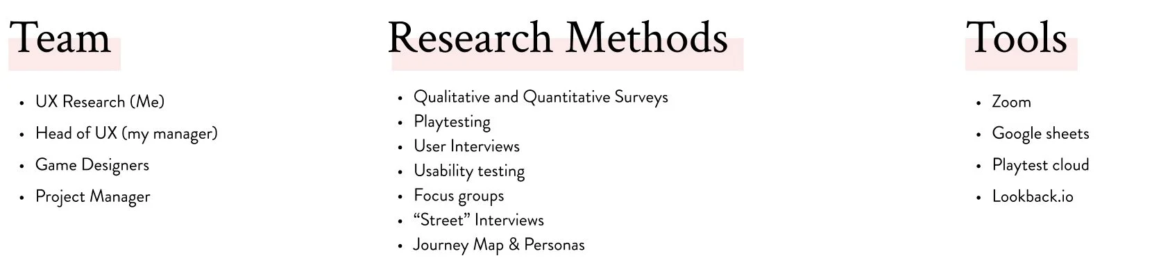 To devise a research plan and define participant criteria, I collaborated with my manager (head of UX), game designers, and project manager to define our research goals and select the most appropriate methods. For defining participant criteria, we relied heavily on input from the game designers who wanted perspectives from a diverse player group. The different types of players mattered, such as competitive players who engage deeply with game mechanics, and casual players who play more sporadically.