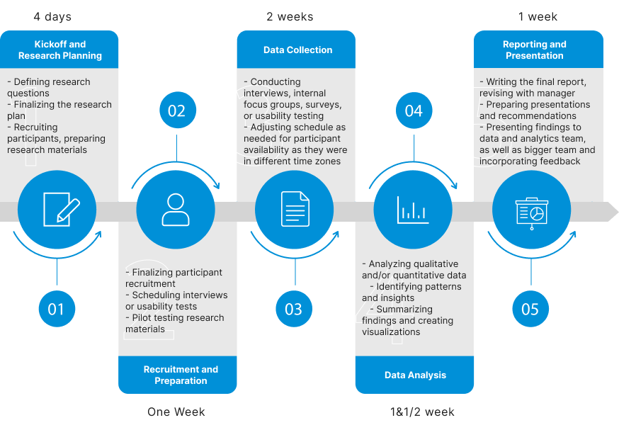For user interviews, we conducted structured qualitative interviews that took 30mins-1hr.